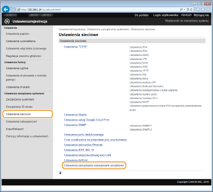 Korzystanie z dodatków do programu iW Management ConsoleNależy włączyć ustawienia dedykowanego portu oraz ustawienia SNMP. W przypadku ustawień SNMP ustawić opcję [Uprawnienia dostępu do MIB] na wartość [Odczyt/zapis] w przypadku zarówno SNMPv3, jak i SNMPv1. Ustawienia portu dedykowanego Monitorowanie i kontrolowanie urządzenia za pomocą protokołu SNMP