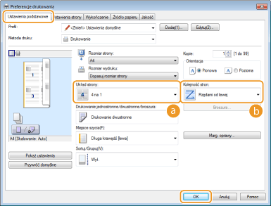 W sekcji [Układ strony] określ liczbę stron, która ma zostać wydrukowana na jednym arkuszu
