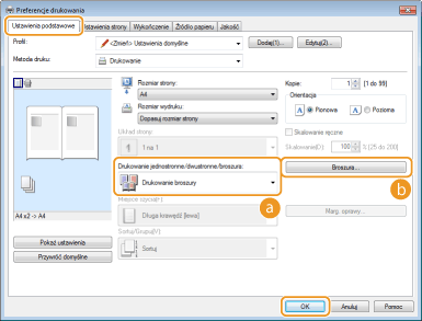 Wybierz opcję [Drukowanie broszury] w sekcji [Drukowanie jednostronne/dwustronne/broszura]