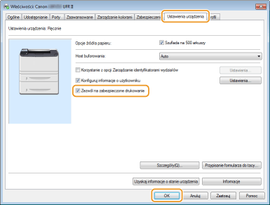 Kliknij zakładkę [Ustawienia urządzenia] i upewnij się, że pole wyboru [Zezwól na zabezpieczone drukowanie] zostało zaznaczone.