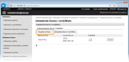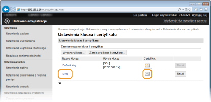 Pary kluczy nie można usunąć, jeśli jest ona obecnie w użyciu, na przykład jeśli w kolumnie [Użycie klucza] wyświetlana jest wartość „TLS” lub „IEEE 802.1X”. W takim przypadku należy przed usunięciem kluczy wyłączyć daną funkcję lub zmienić używaną parę kluczy.