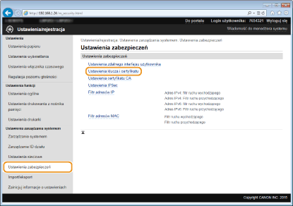 Kliknij [Nazwa klucza] lub [Certyfikat], aby zarejestrować certyfikat.