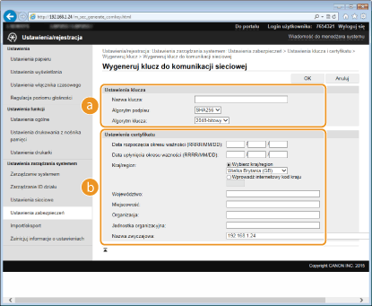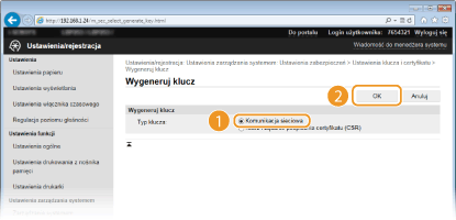 Gdy wymaga tego komunikacja szyfrowana z użyciem protokołu TLS (Transport Layer Security), na urządzeniu można wygenerować parę kluczy. Z protokołu TLS można korzystać podczas uzyskiwania dostępu do urządzenia poprzez Zdalny interfejs użytkownika. Można zarejestrować maksymalnie pięć par kluczy (włącznie z zainstalowanymi fabrycznie). Dla par kluczy wygenerowanych do komunikacji sieciowej używane są certyfikaty z podpisem własnym. W przypadku klucza z żądaniem podpisania certyfikatu (CSR) można wysłać wniosek o certyfikat cyfrowy CA dla pary kluczy wygenerowanej przez urządzenie.