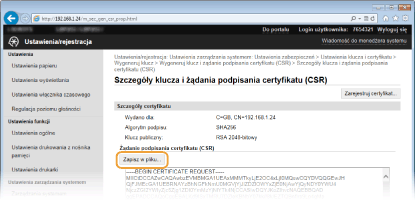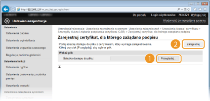 Kliknij przycisk [Zarejestruj], wybierz plik żądania podpisania certyfikatu, a następnie kliknij przycisk [Przeglądaj].