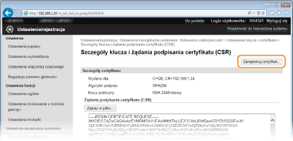 Z pary kluczy wygenerowanych przez żądanie podpisania certyfikatu (CSR) nie można korzystać do momentu zarejestrowania certyfikatu. Certyfikat cyfrowy wydany przez urząd certyfikacji należy zarejestrować, korzystając z poniższej procedury.