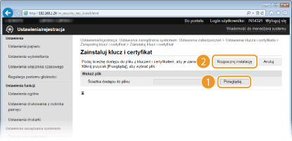 Kliknij [Ustawienia klucza i certyfikatu], aby zainstalować parę kluczy lub [Ustawienia certyfikatu CA], aby zainstalować certyfikat CA.