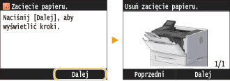 Jeżeli w urządzeniu zakleszczy się papier, na ekranie pojawi się komunikat <Zacięcie papieru.>. Dotknąć opcji <Dalej>, aby wyświetlić proste rozwiązania*. Jeżeli instrukcje wyświetlane na ekranie nie są zrozumiałe, zapoznać się z poniższymi sekcjami, aby usunąć zakleszczony papier.