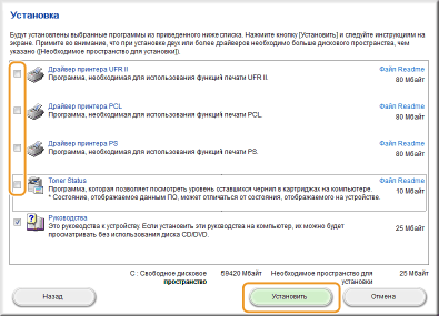 Снимите все флажки, за исключением флажка [Руководства] и нажмите [Установить].