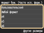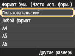 Если приведенный выше экран не отображается при загрузке бумагиЕсли вы всегда загружаете в универсальный лоток бумагу одинакового размера, можно пропустить операции по определению бумаги, выполнив регистрацию размера и типа бумаги в качестве параметра по умолчанию. Однако если зарегистрирован параметр по умолчанию, приведенный выше экран не отображается. Чтобы отобразить этот экран, выберите <Указать при загрузке бумаги> (Регистрация параметров бумаги по умолчанию для универсального лотка).