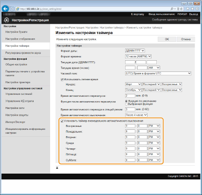 Установите флажок [Установить таймер еженедельного автоматического выключения] и задайте время выключения питания.
