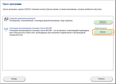 Нажмите кнопку [Запуск] для инструмента [Помощник беспроводной установки Canon MF/LBP].