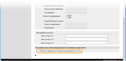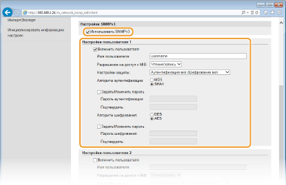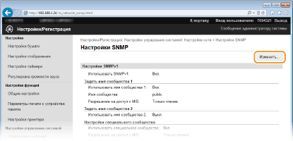Если включены обе версии SNMP, рекомендуется задать для разрешений SNMPv1 на доступ к объектам MIB значение [Только чтение]. Разрешение на доступ к объектам MIB можно задать отдельно в SNMPv1 и SNMPv3 (а также для каждого из пользователей в SNMPv3). При выборе [Чтение/запись] (разрешение на полный доступ) в SNMPv1 снижает эффективность функций безопасности, которые отличают протокол SNMPv3, поскольку большинство параметров аппарата можно контролировать посредством SNMPv1.