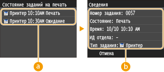 ![]() <Состояние заданий на печать>Отображает список документов, находящихся в процессе обработки или ожидающих обработки.