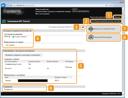 Отображение текущего состояния и информации об ошибках аппарата. Если возникает ошибка, отображается ссылка на страницу сведений об ошибке.