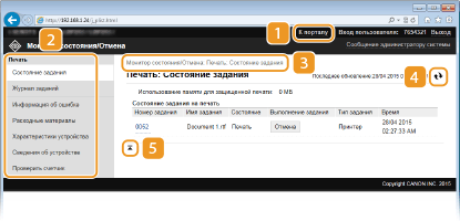 Отображает страницу [Монитор состояния/Отмена]. На этой странице можно проверить текущее состояние печати, отменить обработку печати и посмотреть журнал заданий печати.