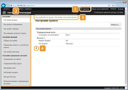 Показывает страницу [Настройки/Регистрация]. При выполнении входа в систему в режиме администратора системы можно изменять параметры и сохранять/загружать зарегистрированные данные.
