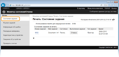 Нажмите [Номер задания] на документах, печать которых была приостановлена, или для которых используется безопасная печать, чтобы просмотреть подробную информацию. Можно просмотреть имя пользователя и количество страниц печатаемого документа.