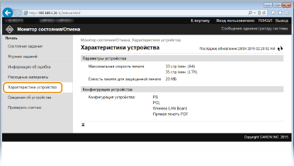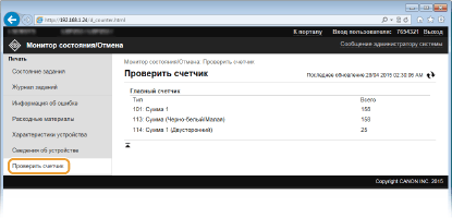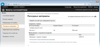 Отображение формата и типа бумаги для источника бумаги, номера модели картриджа с тонером и других сведений. Для отображения экрана проверки расходных материалов можно также нажать кнопку [Проверить сведения о расходных материалах] на странице портала (главной странице).