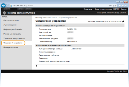 Отображение сведений об аппарате и администраторе системы. Эти сведения можно найти в [Управление системой] на странице [Настройки/Регистрация].