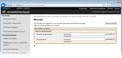Введите пароль для шифрования (не более 32 буквенно-числовых символов). Подтвердите пароль в поле [Подтвердить]. Пароль для шифрования требуется для экспортирования данных.