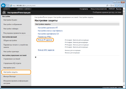 Использование панели управленияФильтрацию IP-адресов можно также включить или отключить в <Меню> на экране Главный. Фильтр IPv4-адресов Фильтр IPv6-адресов