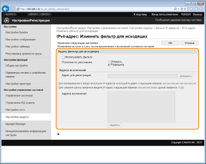 При неправильном вводе IP-адресов доступ к аппарату из Удаленного ИП может быть невозможен. В этом случае необходимо установить для <Фильтр IPv4-адресов> или <Фильтр IPv6-адресов> значение <Выкл.>. Фильтр IPv4-адресов Фильтр IPv6-адресов