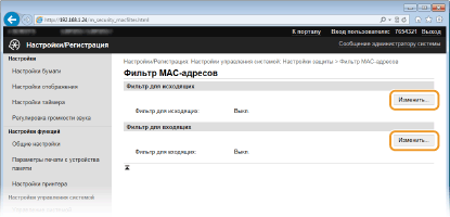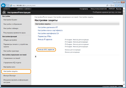 При неправильном вводе MAC-адресов доступ к аппарату из Удаленного ИП может быть невозможен. В этом случае необходимо указать для <Фильтр MAC-адресов> значение <Выкл.>. Фильтр MAC-адресов