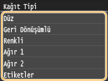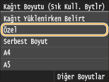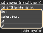 Varsayılan kağıt ayarı kaydedildikten sonra, kağıt yüklendiğinde kağıt ayarı ekranı görüntülenmez ve her zaman aynı ayar kullanılır. Kağıt ayarlarını değiştirmeden farklı bir kağıt boyutu veya türü yüklerseniz, makine düzgün yazdırmayabilir. Bu sorunu önlemek için, 4 adımında <Kağıt Yüklenirken Belirt> öğesini seçin ve sonra kağıdı yükleyin.