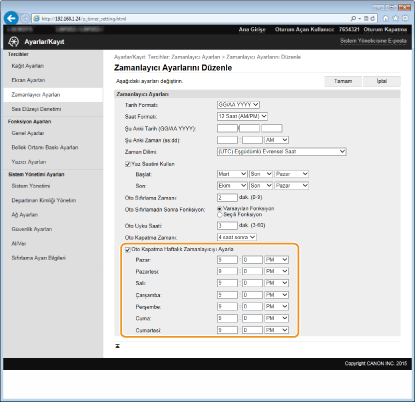 [Oto Kapatma Haftalık Zamanlayıcıyı Ayarla] onay kutusunu işaretleyin ve gücü KAPATMA zamanını ayarlayın.