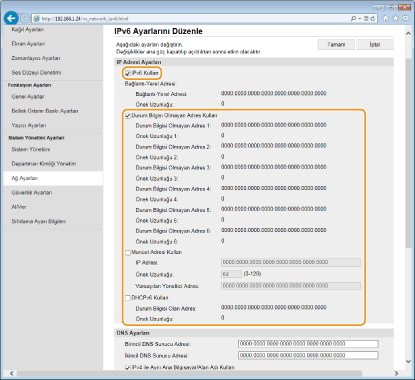 Makinenin IPv6 adresleri, Uzak Kullanıcı Arabirimi aracılığıyla yapılandırılabilir. IPv6 adreslerini ayarlamadan önce IPv4 adres ayarlarını (IPv4 Ayarlarını Görüntüleme) denetleyin. IPv6 adreslerini kullanmak için, doğru IPv4 ayarlarını yapmanız gerekir. Makine, şu IPv6 adreslerinden en fazla dokuzunu kullanabilir:
