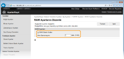 RAW aracılığıyla yazdırmak için onay kutusunu seçin. RAW yazdırma kullanılmadığında onay kutusunu temizleyin. [Alım Zamanaşımı]