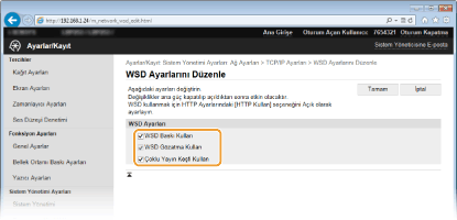 WSD aracılığıyla bir bilgisayardan makine hakkında bilgi almak için onay kutusunu seçin. [WSD Baskı Kullan] onay kutusu seçildiğinde bu onay kutusu otomatik olarak seçilir. [Çoklu Yayın Keşfi Kullan]