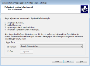 ![]() ![]() Bir sonraki ekran görüntülendiğinde, ekrandaki yönergeleri uygulayın. ![]() * [Aygıt Türü] seçerken, [Standart] öğesi altında , [Canon Network Printing Device with P9100] seçeneğini seçin.