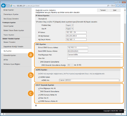 Bonjour tarafından kabul edilen mDNS (çok noktaya yayın DNS), DNS kullanmadan ana bilgisayar adını bir IP adresi ile ilişkilendirme protokolüdür. mDNS'yi etkinleştirmek için onay kutusunu seçin ve [mDNS Adı] metin kutusuna mDNS adını girin. [DHCP Seçenek Ayarları][Ana Bilgisayar Adı Al]