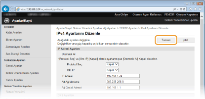 İşletim panelinden ayarların seçilmesiDNS ayarlarına, Ana Ekran ekranındaki <Menü>. öğesinden de erişilebilir. IPv4 Ayarları IPv6 Ayarları