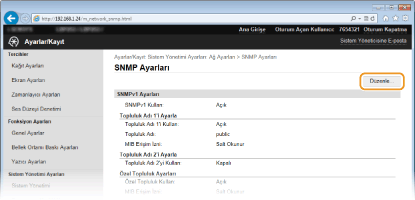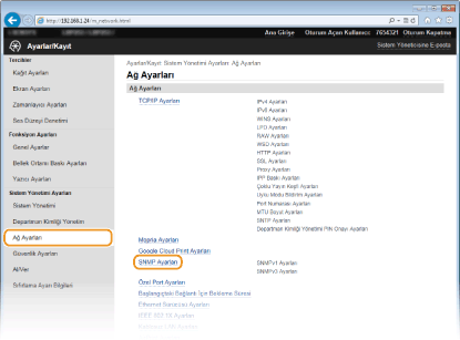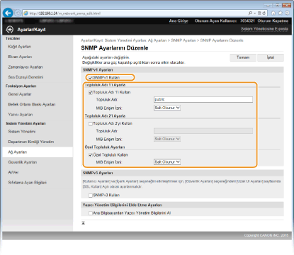 Basit Ağ Yönetimi Protokolü (SNMP), Yönetim Bilgi Tabanı (MIB) kullanılarak bir ağdaki iletişim aygıtlarını izleme ve denetleme protokolüdür. Makine, SNMPv1'i ve güvenliği geliştirilmiş SNMPv3'ü destekler. Belgeleri yazdırırken veya Uzak Kullanıcı Arabirimi'ni kullanırken bir bilgisayardan makinenin durumunu denetleyebilirsiniz. SNMPv1 veya SNMPv3'ü ayrı ayrı veya her ikisini de aynı anda etkinleştirebilirsiniz. Her bir sürümün ayarlarını, ağ ortamınıza ve kullanım amacınıza uyacak şekilde belirtin.