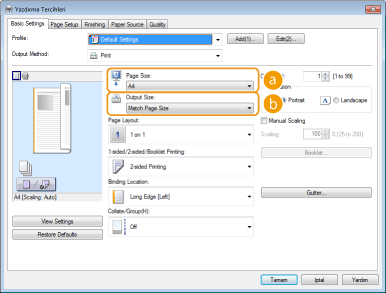 Sayfa düzenini, ciltleme konumunu, vb. ön izleme görüntüsü üzerinde sezgisel olarak kolayca seçebilirsiniz. Daha fazla bilgi için, yazıcı sürücüsü ekranında [Help] (Yardım) düğmesini tıklatın.