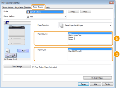 Kağıt kaynağı, yazdırılmak üzere belirtilen kağıt boyutu ve türü ile makinede yapılandırılan ayarlara göre otomatik olarak seçilir.