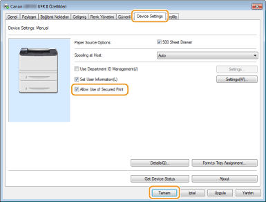 [Device Settings] (Aygıt Ayarları) sekmesini tıklatın ve [Allow Use of Secured Print] (Güvenli Yazdırma Kullanımına İzin Ver) onay kutusunun seçildiğinden emin olun.