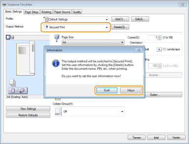 [Output Method] (Çıkış Yöntemi) İçinde [Secured Print] (Güvenli Yazdırma) öğesini seçin.