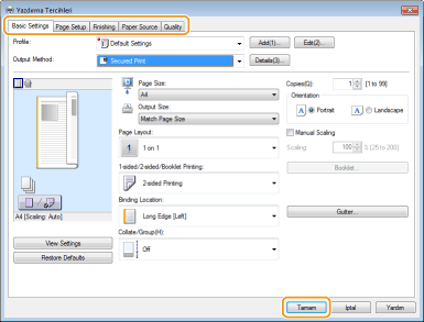Her bir ekranda yazdırma ayarlarını gerektiği gibi belirtmek için, [Basic Settings] (Temel Ayarlar), [Page Setup] (Sayfa Yapısı), [Finishing] (Son İşlem), [Paper Source] (Kağıt Kaynağı) veya [Quality] (Kalite) sekmelerini tıklatın.