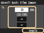 Makinenin güvenli belgeleri ne kadar süre tutacağını belirtin ve <Uygula> öğesine dokunun.