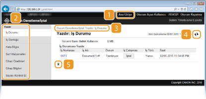 [Durum Denetleme/İptal] sayfasını görüntüler. Bu sayfayı, geçerli yazdırma durumunu denetlemek, yazdırma işlemini iptal etmek ve yazdırma işlerinin bir geçmişini görüntülemek için kullanabilirsiniz.