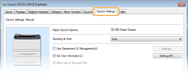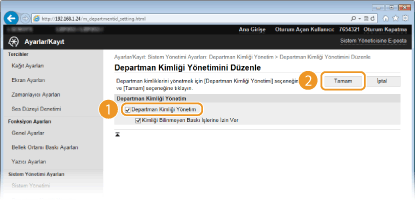 [Use Department ID Management] (Departman Kimliği Yönetimini Kullan) onay kutusunu seçin ve sağındaki [Settings] (Ayarlar) öğesini tıklatın.