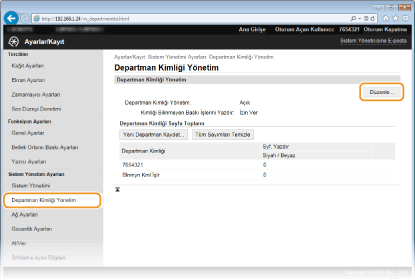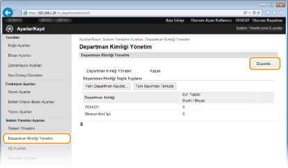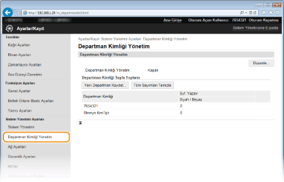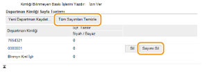 Sayıları sıfırlamak istiyorsanız, [Departman Kimliği] altındaki ilgili metin bağlantısını tıklatın ve ardından [Sayımı Sil]