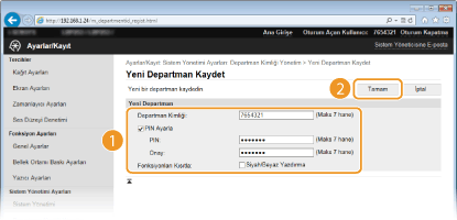 Departman Kimliği için PIN ayarlandıysa, PIN için en fazla yedi basamaktan oluşan bir sayı girin.