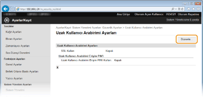 ![]() İşletim panelini kullanmaUzak Kullanıcı Arabirimi Erişim PIN'ini, Ana Ekran ekrandaki <Menü> öğesinden de ayarlayabilirsiniz. Uzak Kullanıcı Arabirimi Ayarları