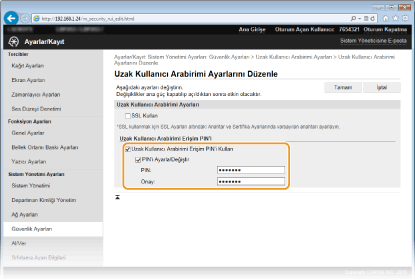 Uzak Kullanıcı Arabirimi ayarları başlangıç konumuna alınırsaUzak Kullanıcı Arabirimi PIN'i de başlangıç konumuna alınır. Başlangıç konumuna alındıktan sonra PIN'i sıfırlayın. Menüyü Başlangıç Durumuna Getirme
