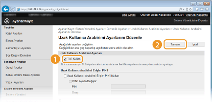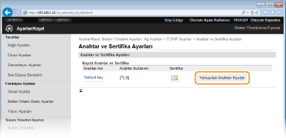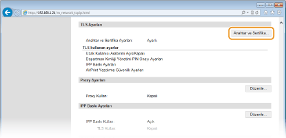 Bilgisayardaki bir Web tarayıcı ve makine arasında gerçekleşen iletişimi Aktarım Katmanı Güvenliği (TLS) kullanarak şifreleyebilirsiniz. TLS, ağ üzerinden alınan veya verilen verileri şifrelemek için kullanılan bir mekanizmadır. Şu ayarları belirtmek için Uzak Kullanıcı Arabirimi kullanılırken TLS etkinleştirilmelidir: IPSec (Ön-Paylaşımlı Anahtar Yöntemi), IEEE 802.1X kimlik doğrulaması (TTLS/PEAP), SNMPv3. Uzak Kullanıcı Arabirimi için TLS kullanmak istiyorsanız bir anahtar çifti ayarlamanız ve TLS işlevini etkinleştirmeniz gerekir. TLS’yi etkinleştirmeden önce TLS için anahtar çiftini oluşturun veya yükleyin (