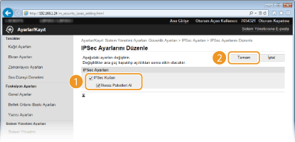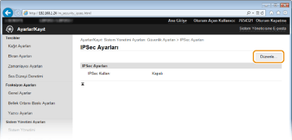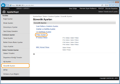İşletim panelini kullanmaIPSec iletişimini, Ana Ekran ekranındaki <Menü> öğesinden de etkinleştirebilir veya devre dışı bırakabilirsiniz. IPSec Kullan